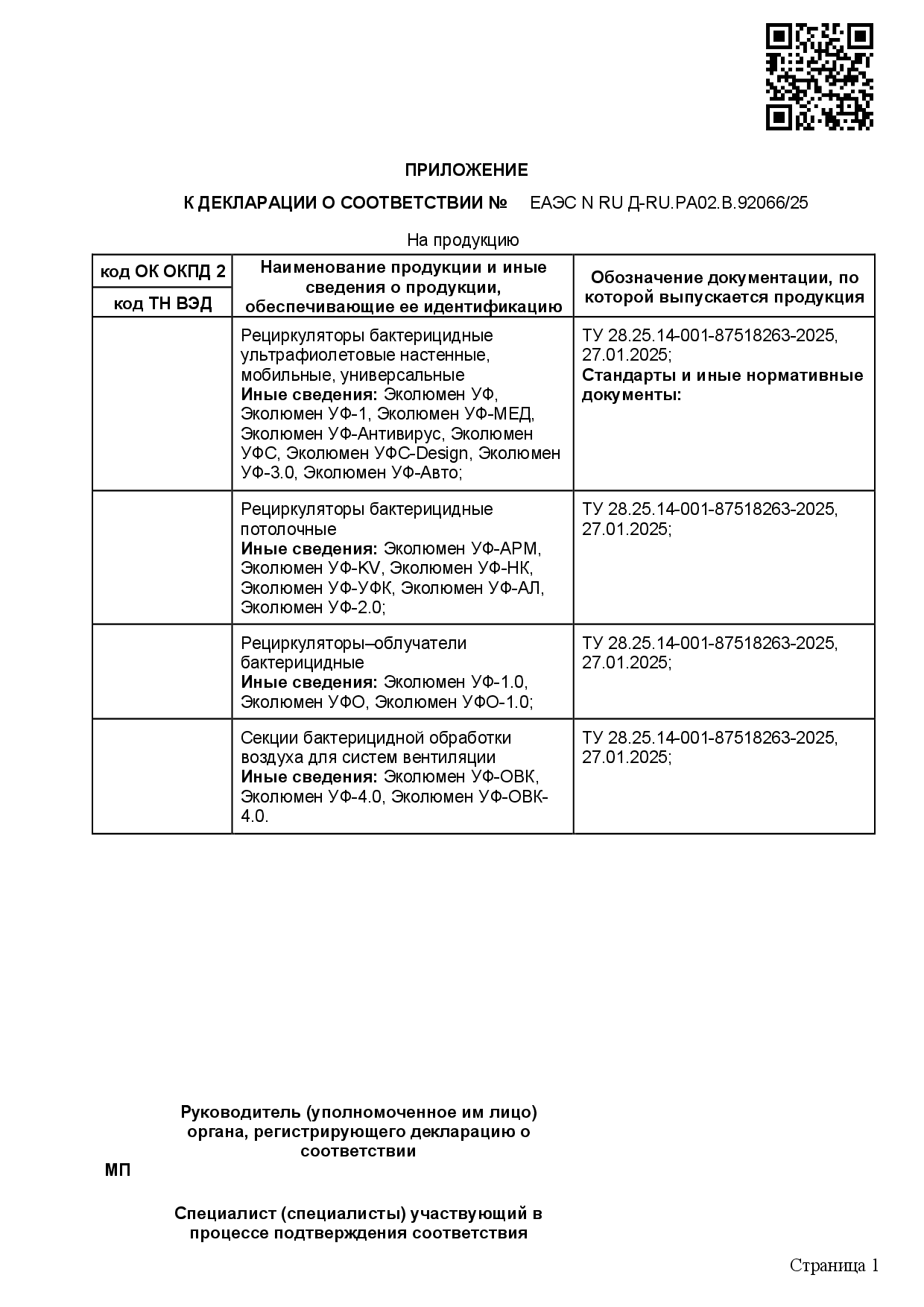 Бактерицидные рециркуляторы соответствуют требованиям ТР ТС 004/2011 «О безопасности низковольтного оборудования» и ТР ТС 020/2011 «Электромагнитной совместимости технических средств»