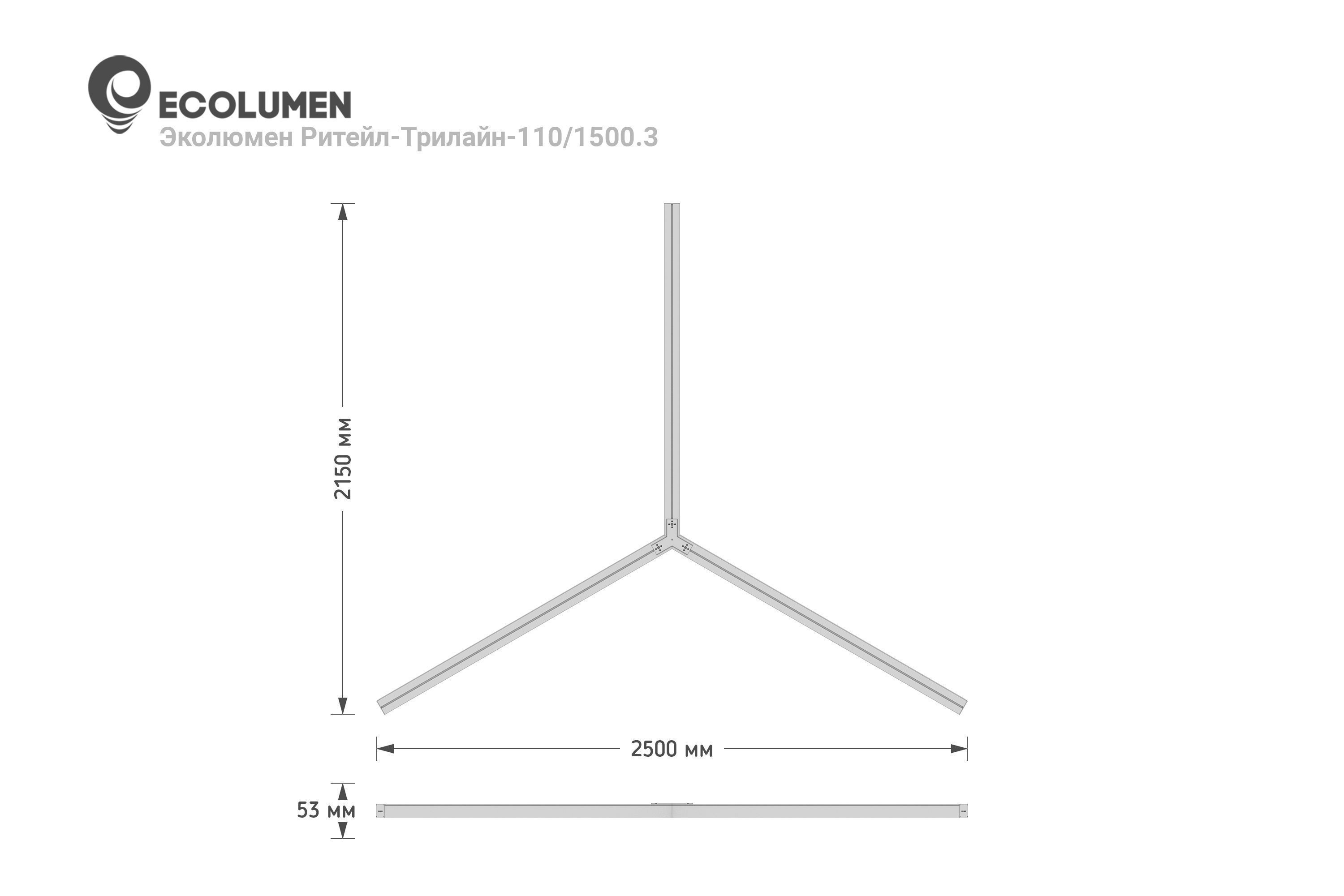 «ECOLUMEN-RETAIL-TRILINE» - российские светодиодные дизайнерские светильники в виде трёхлучевой звезды. Светильники изготовлены из алюминиевого профиля 60х60мм, образующего три равных по длине луча, под углом 120 градусов. Светильники дизайнерского освещения «Эколюмен-Трилайн» используются для освещения офисных и торговых площадей, кафе, магазинов и студий в стиле «лофт» и прочих помещений с потребностью в дизайнерском свете. Y-образная конструкция светильников позволяет собирать их в различные фигуры, парящие в воздухе на подвесах или размещать их на потолке либо стенах накладным способом. Опционально производятся модели для встраивания в подвесной потолок. Завод изготовитель дизайнерских светильников «Эколюмен» кроме трехлучевых конструкций производит и светильники других конфигураций: крест, квадрат, треугольник, прямоугольник, ломаная линия и др. Светильники изготавливаются с разным световым потоком от 3000 до 20000 Лм и могут использоваться как в качестве декоративного освещения и подсветки, так и в качестве основного освещения объекта. Светильники «Ритейл-Трилайн» изготавливаются с длиной лучей от 300 до 2000мм. Изделия комплектуются подвесами длиной 2 метра и окрашиваются в любой цвет по таблице RAL.